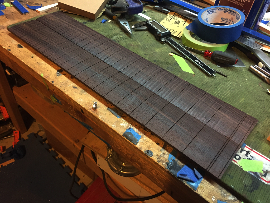 Moving right along, fretboards need slots to press the fret wire into. I used to do this the “old fashioned way” literally using a narrow kerf hand saw. While that works quite well, it is very time consuming and generates the possibility of human error. There are many places in guitar building where being off by small amounts means literally nothing with regard to how well the guitar plays, looks, or sounds. Fret placement and spacing is not one of those areas 🙂