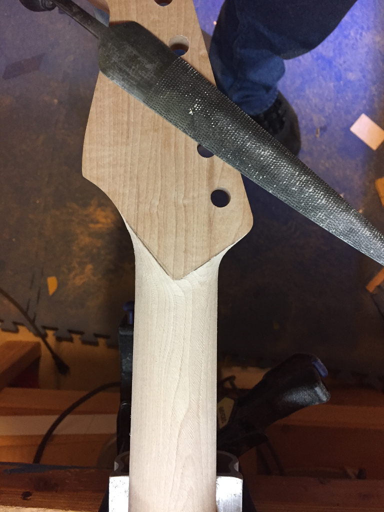 Neck I attack the transitions at the headstock and heel. This is all hand work with rasps…