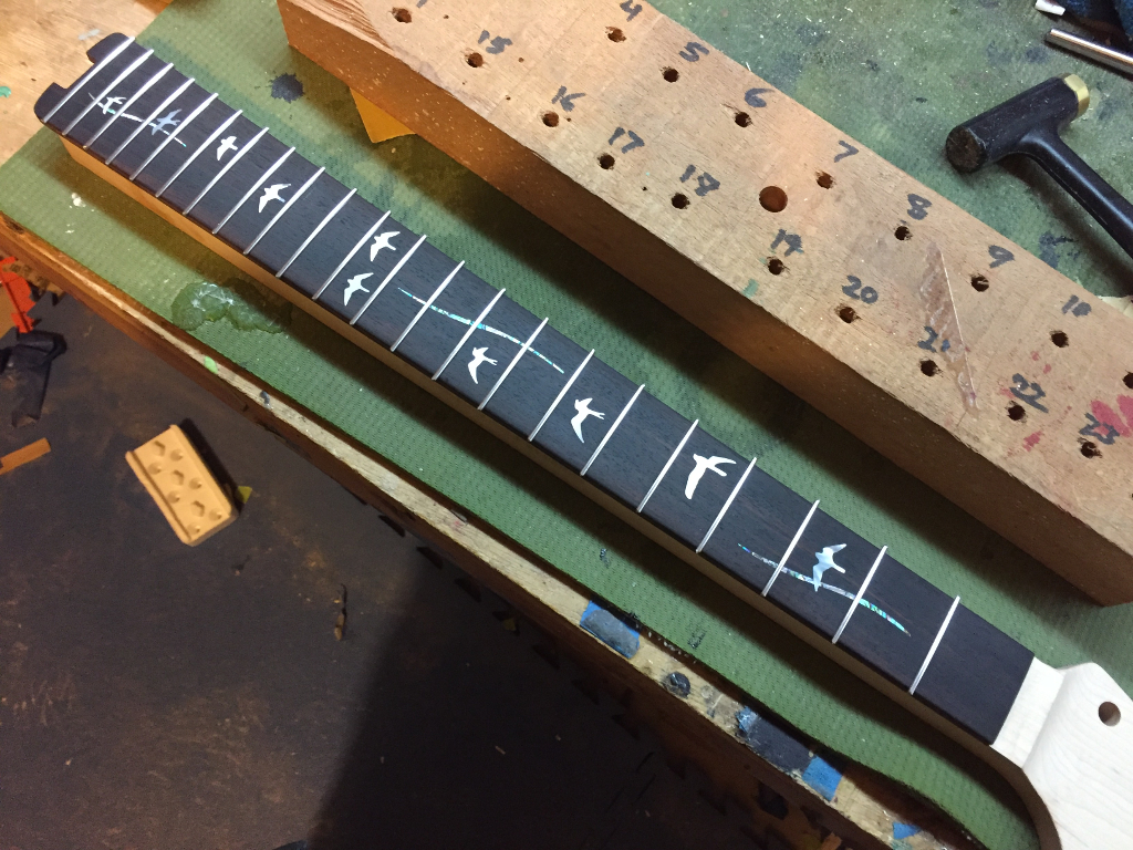All the frets are now in, but obviously too long.